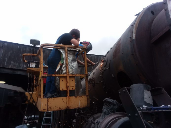 Work is continuing on 4070. During September, as weather permitted, the locomotive was pulled out of stall four so that work could continue on burning the rivets for removal of the smoke box. There is a large number of rivets and it is a slow process. Moving the locomotive outside limited the possibility of a fire caused by the sparks generated during this process. To facilitate safety, a volunteer is on fire watch duty hosing the ground around the work area to further minimize the risk. Initially, the crew experienced problems during the burning process and decided to look for an alternate method. It is important to note that during this process, damage to the adjoining steel is minimized. Greg Antz, who is leading this portion of the project, explained that because the smoke box and rivets are of a similar steel it was hard to differentiate between the two while burning. Greg was given some assistance from our friends at American Steam. They are the group that is performing the restoration of the Reading Railroad steam locomotive 2100 in stall two of the roundhouse. Their suggestions were helpful. Once the rivets have been removed, work will continue by removing the smoke box and a new one will be rolled and readied for installation later on in this project. Following this, the next step willbe the removal of the tube sheet and the dry pipe. The tube sheet will be replaced with a new one. Lincoln Electric will donate their services for the cutting process. The hope is that most of this work will be completed before winter sets in.