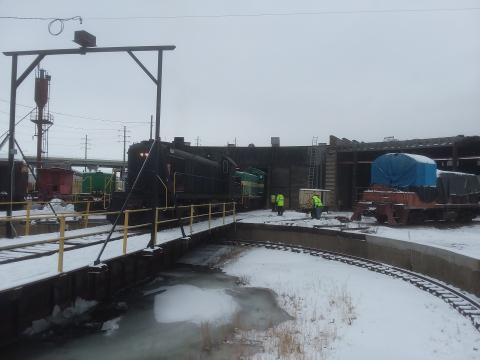 On Saturday January 26th, there were enough volunteers available to form a number of work groups. A lot of switching needed to be done in the yard so crews were formed by Steve Emling to operate the trackmobile, the Alco 123 and the bulldozer for rotating the turntable. Jon Jaros of Horizon Rail also chipped in with the use of his trackmobile since a number of the moves involved his and his customer's equipment. The crews braved the cold temperatures and the icy ground and worked through quite a few weather related difficulties to complete their tasks.